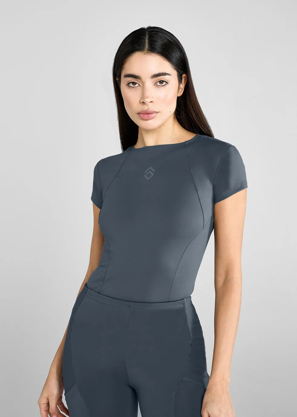 Short sleeves, mid-high collar with zip opening